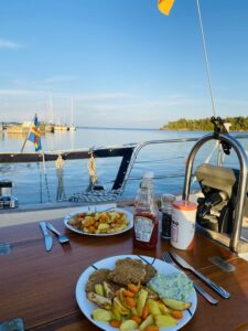 Sotunga war meiner Meinung nach eine der schönsten Ålandinseln. Der HAfen war gut gepflegt, absolut perfekte Sanitäranlagen und schön angelegt. Das Restaurant, berühmt für gute Schnitzel, leider nichts für uns. Daher gab es Haferflockenschnitzel im Cockpit.