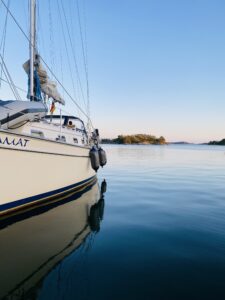 Wir verlassen die finnische Inselwelt und segeln zurück über den Skiftet nach Åland. Im August scheint die Hauptsaison vorüber. Die meisten Stege sind deutlich leerer. Wir sind immer noch ein wenig krank, aber da hilft segeln doch am besten gegen. Wir segeln rund 30 Meilen mit fantastischen NW-Wind und Sonnenschein. Unterwegs gibt es plötzlich ein lautes Geräusch. Etwas hat gegen den Rumpf geschlagen. Eine Nordtonne hat sich unnötigerweise direkt vor uns positioniert und uns gerammt. Ganz klarer Fall, wir waren Kurshalter. Zum Glück war es eine aus Plastik und eher kein.