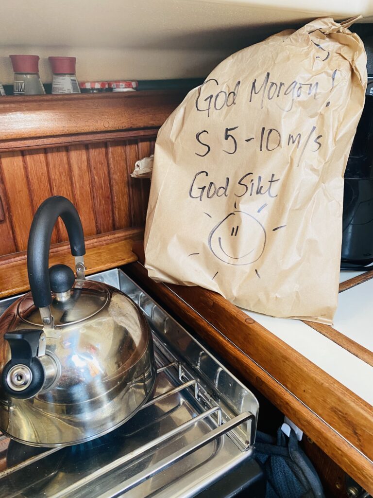 Morgens liegt eine Tüte mit frischem, duftenden Brot auf unserem Bugspriet. Wir packen es ein, denn frühstücken wollen wir unterwegs. Wie immer sind wir ein bisschen später dran als geplant. Viele Boote sind auf dem Weg Richtung Schweden. Der Urlaub neigt sich für viele dem Ende zu. Die Windverhältnisse in den kommenden Tagen sind nicht ideal. Eine kleine Flottille macht sich auf nach Westen.