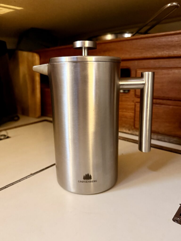 Die Metallkanne (French press) hält gut warm und wir lieben einfach diese Art der Kaffeezubereitung. Und die passenden Becher sind absolut dicht und sehr robust. Alles 100% plastikfrei und unverwüstlich!