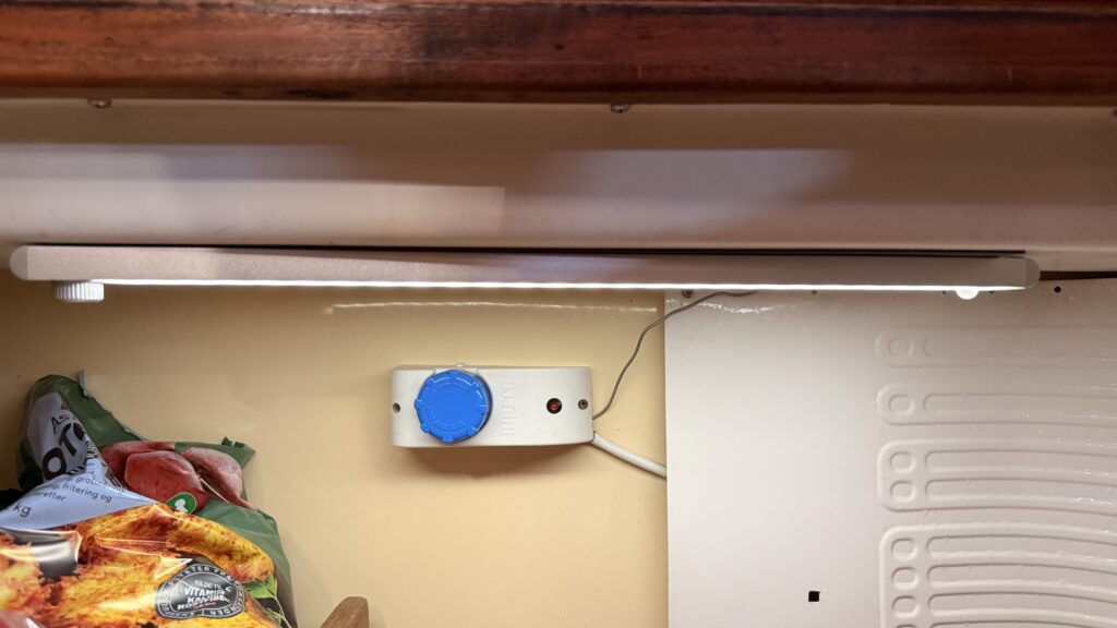 Natürlich kein Muss und Segel-Puristen werden den Kopf schütteln. Aber wenn man an Bord lebt, dann sind es die kleinen Dinge, die einem das Leben etwas leichter machen. Wie das Licht im Schrank, das automatisch angeht, wenn man ihn aufmacht. Haben wir im Kühlschrank und im Schrank unter der Spüle, wo nur wenig Licht hinkommt.