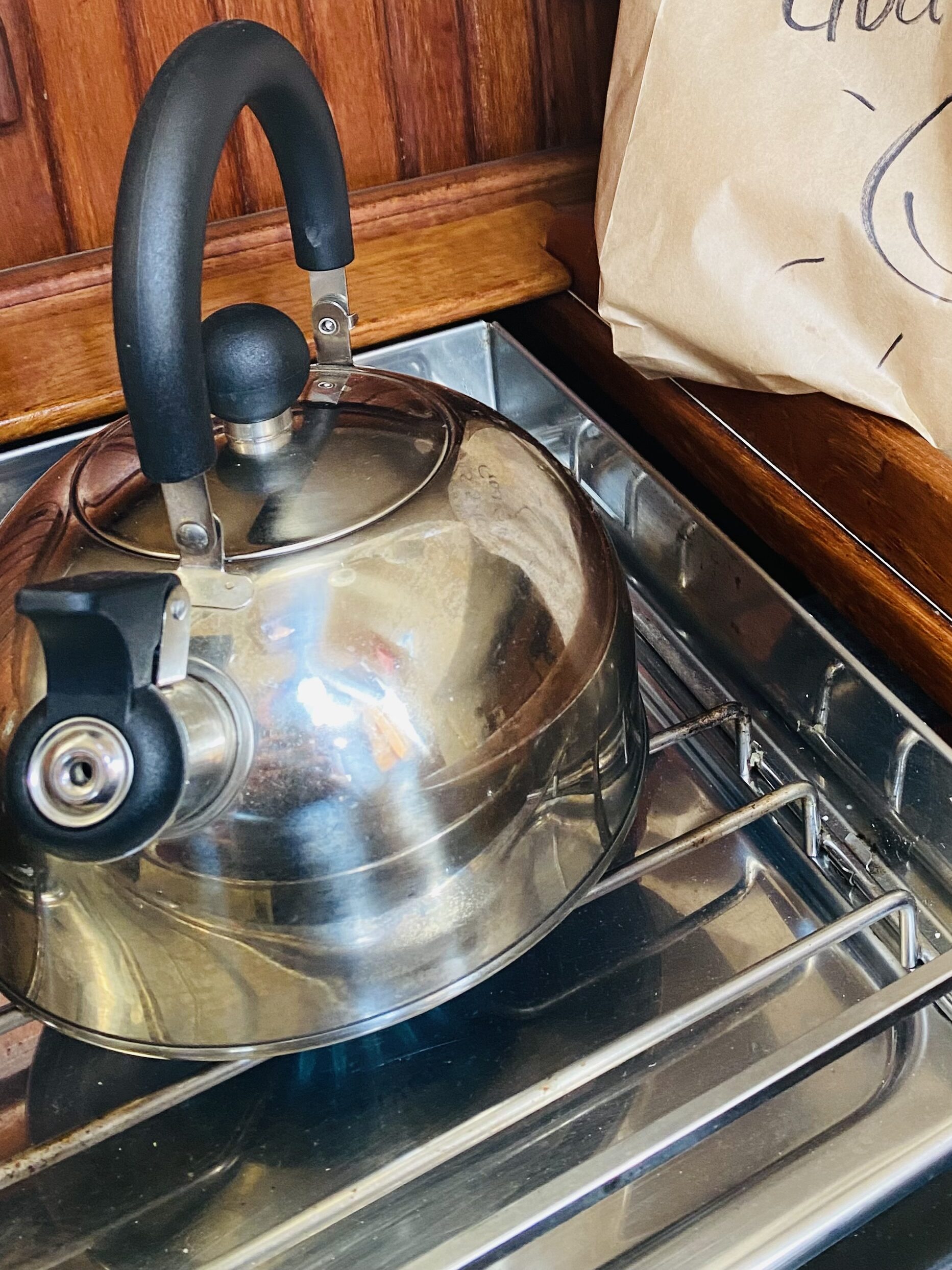 Wenn wir vor Anker oder unterwegs sind und keinen 220 V Strom haben, kochen wir mit Gas. Fürs Wasserkochen haben wir einen kleinen Pfeifkessel gekauft. Wir mochten nicht nur das Retrodesign, sondern auch, dass man mit dem Gas spart.