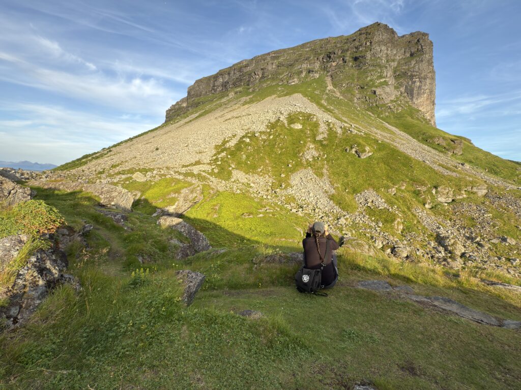 Man sieht die kleine Insel, die hauptsächlich aus dem charakteristischen Lovundfjellet besteht, schon von Weitem deutlich. Der massive Berg ragt über 600 Meter aus dem Meer. Und um es gleich vorweg zu nehmen: Wir haben ihn nicht bestiegen, auch wenn wir während unser Reise viele Gipfel erklommen haben. Den haben wir ausgelassen. Denn selbst auf der norwegischen Wanderskala von grün (ganz leicht) bis schwarz (richtig schwer) war der dunkelschwarz. Die Wanderroute ging so steil über Geröllfelder, sodass wir umkehrten und wir lieber eine andere Tour gemacht haben. Es gibt auf der Insel mehrere lohnenswerte Ziele mit leichteren Wegen. Und das macht Lovund für uns zu einem absoluten Edelstein unter den vielen Inseln: So klein wie sie auch ist, so vielfältig sind die Möglichkeiten dort seine Zeit zu verbringen: Wandern, Vögel beobachten/fotografieren, Baden, Kajaken oder einfach die Seele baumeln lassen.