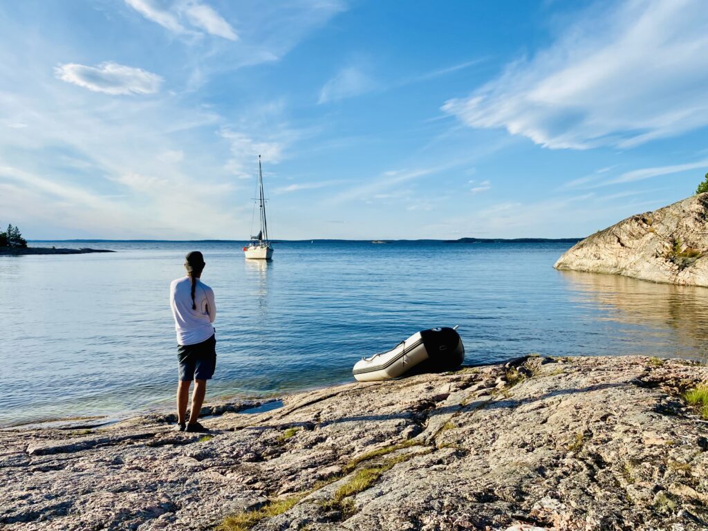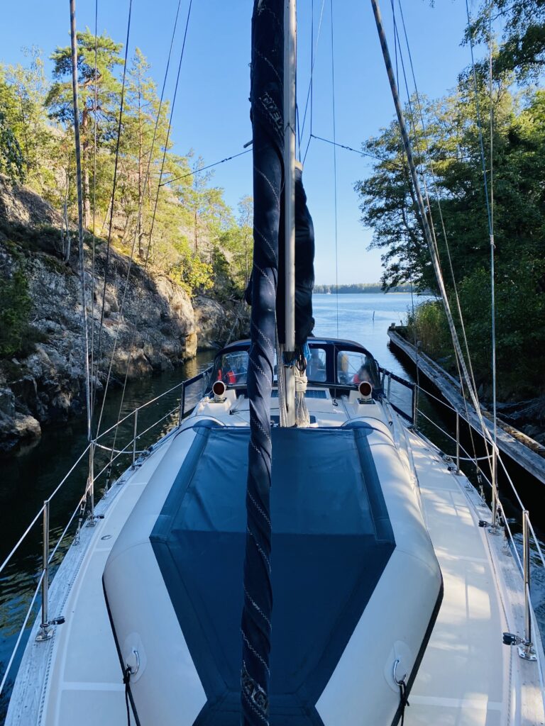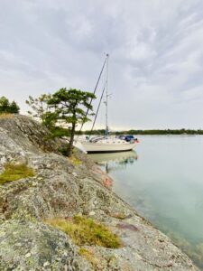 Der krönende Abschluss (fast) unserer Zeit in den ostschwedischen Schären war jedoch Ringsön, wo wir erst einen Tag vor Anker lagen und einen Plan schmiedeten. Endlich Schärenankern. Am Freitagnachmittag nach der Arbeit gab es eine Manöverbesprechung und dann nahmen wir all unseren Mut zusammen und fuhren an den Stein. Der Heckanker saß sofort und auch wenn es allem in allem eine gefühlte Ewigkeit gedauert hat, bis wir alle Landleinen irgendwo festmachen konnten (es gab keine Ringe), war ich überglücklich. Nur so ist Schwedensegeln richtig.