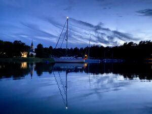 Die zweite Urlaubswoche machen wir noch ein bisschen Inselhopping Richtung Nynäshamn. Zunächst geht von Högmarsö nach Ramsmora (Boje), wo wir ein wenig mit unserer Besegelung herumprobieren: Das Goß einfach gerefft, die Genua zweifach und die Fock geht für um die 20 Knoten richtig gut. Als nächster Stop war Runmarö geplant. Es war nicht weit, aber durch die wunderschönen Stockholmer Schären trotzdem ein toller Trip. Eine absolute Perle war für uns Västra Runmaren, Eigentlich hatten wir uns einen Platz herausgesucht, wo wir das erste Mal Schärenankern wollten. Aber dort angekommen wollten wir nicht bleiben. Überall langen Fischernetze, kaputte Krabbenpötte. Nicht einladend. Dafür hier umso mehr. Klares Wasser, ein kleines Wäldchen, ein Barbecue-Platz. Perfekt. Danach noch einen Stop auf Utö, wo wir wieder an der Kirche lagen (Kyrkviken) und unseren Freund Tobias noch mal wiedertrafen. In Nynäshamn wuschen wir noch mal Wäsche und kauften ein.