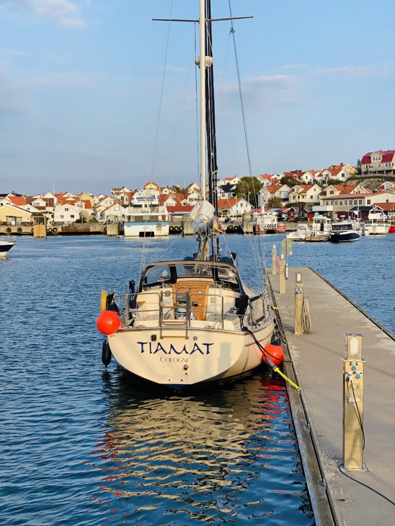 Zwei Tage später geht es weiter die Küste runter. Wir nehmen jetzt alles mit, was im Sommer zu voll ist für unseren Geschmack. An Lysekil vorbei geht es ins fast schon legendäre Bassholmen. Statt für den Anleger entscheiden wir uns für die Boje ganz in der Nähe und fahren mit dem Dinghy zum Ufer, um die Insel zu erkunden. Gerade als wir am Hafen sind, kommt ein Boot eingelaufen, das uns bekannt vorkommt. Es ist die Magic Carpet mit Maya und Aladino, deren YouTube Kanal wir schon lange folgen. Wir lassen sie in Ruhe anlegen und schnacken kurz mit Aladino. Am Tag darauf geht’s weiter nach Gullholmen. Eine schöne Insel, aber der Hafen taugt nicht so viel. Der Steg ist nicht gut in Stand, die Sanitäranlagen so lala. Wir sind noch von Malmön verwöhnt.